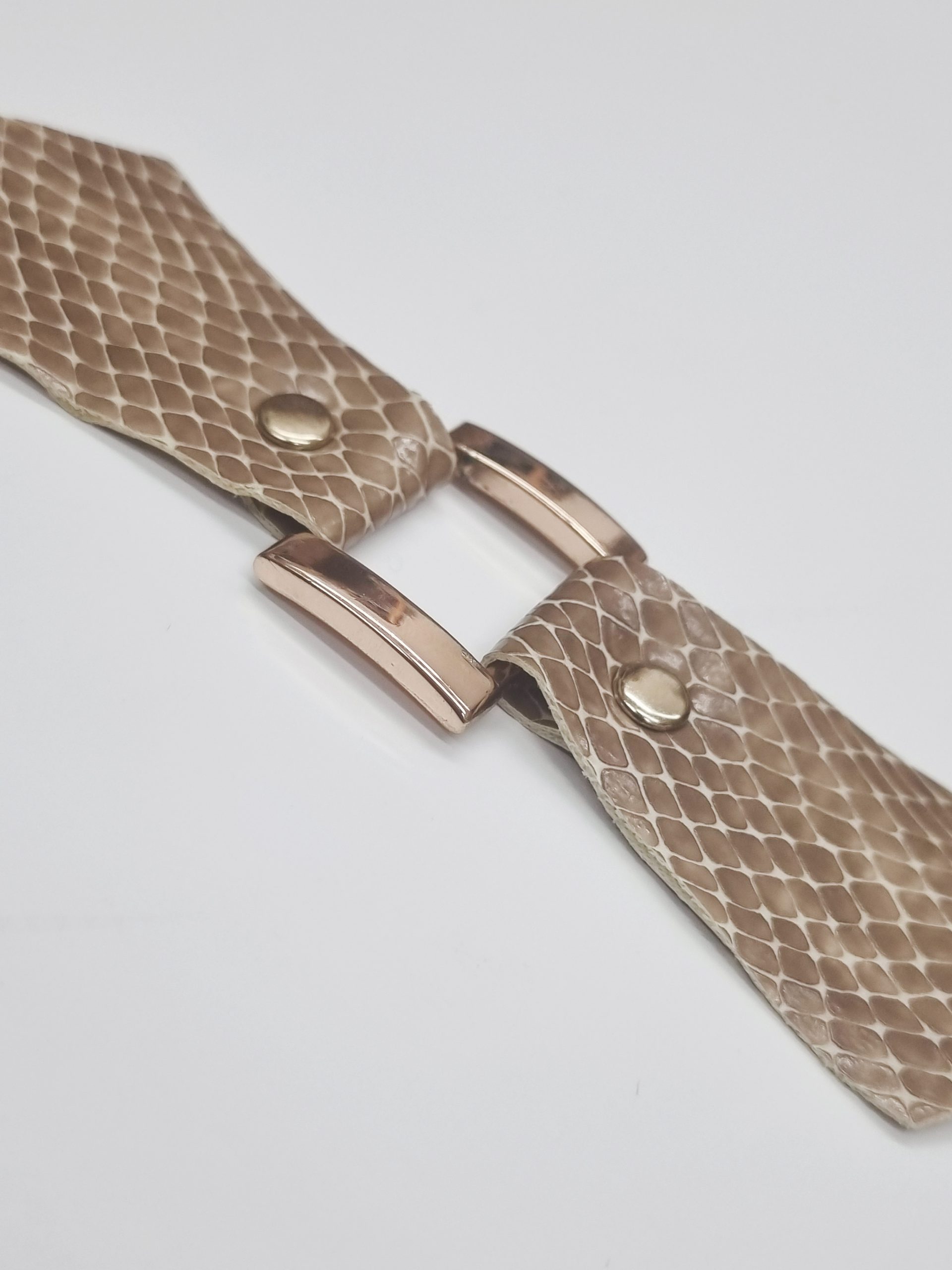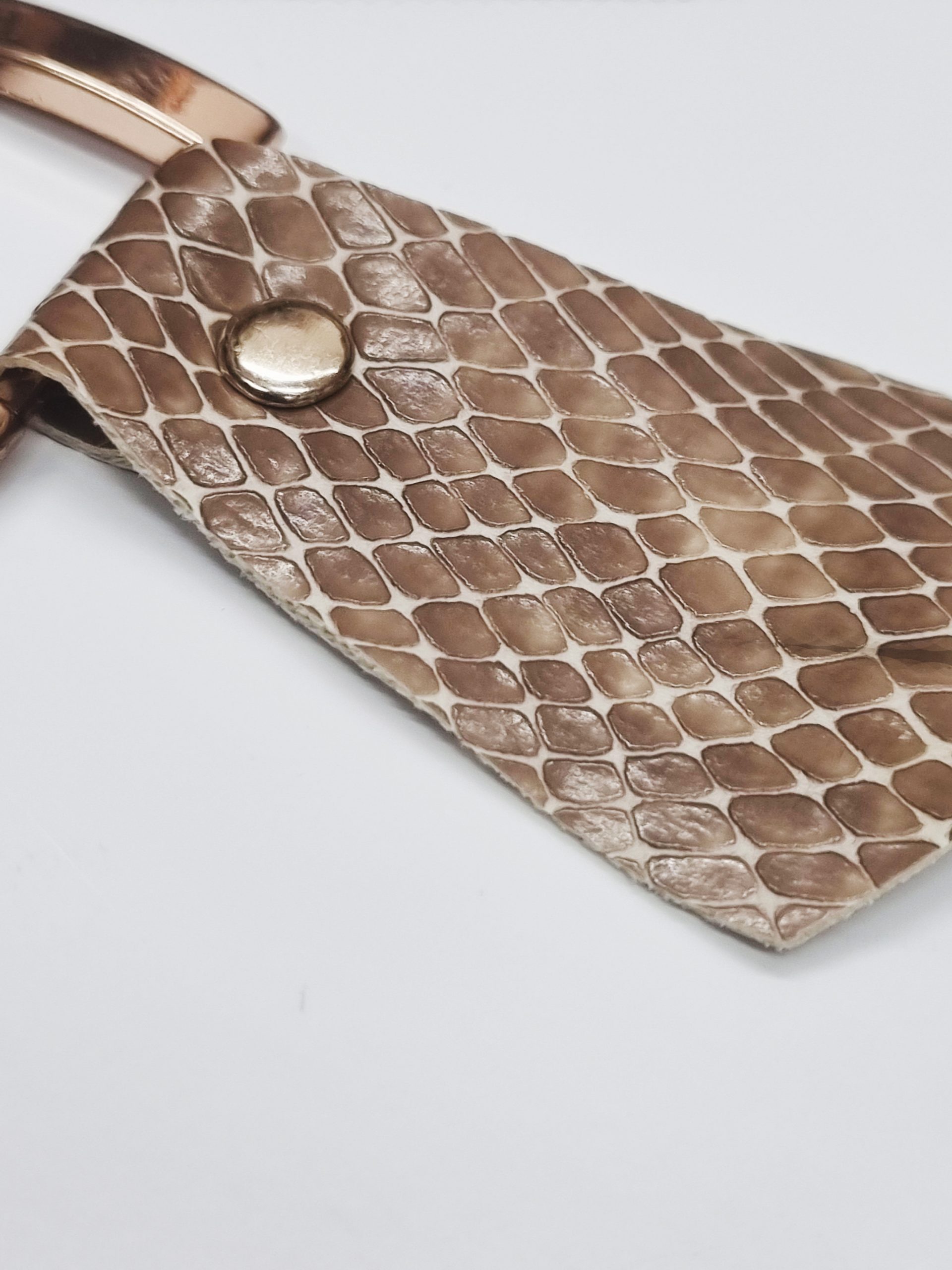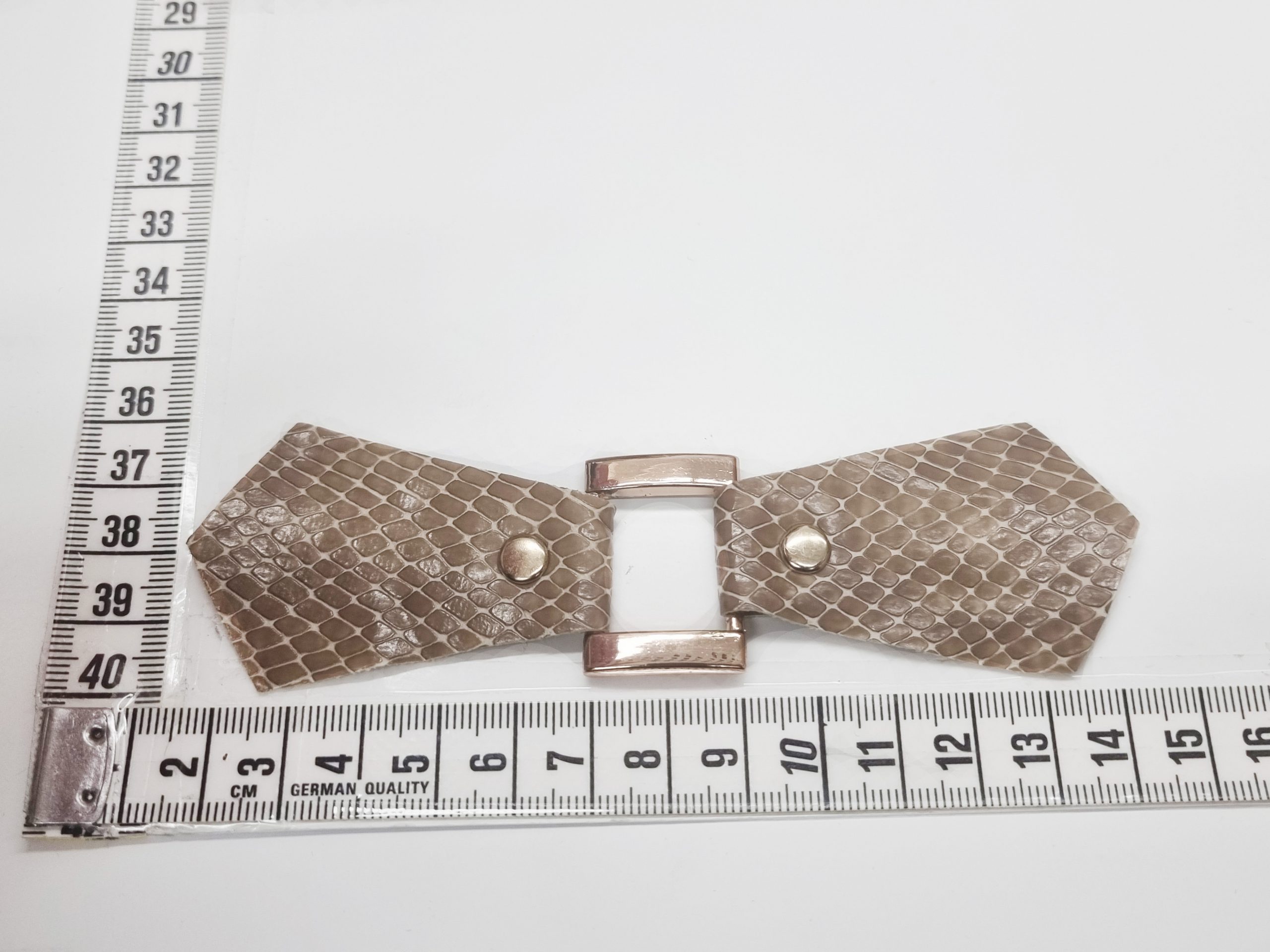 Petite attache, qu’on appelle aussi patte, en imitation peau de serpent et métal.