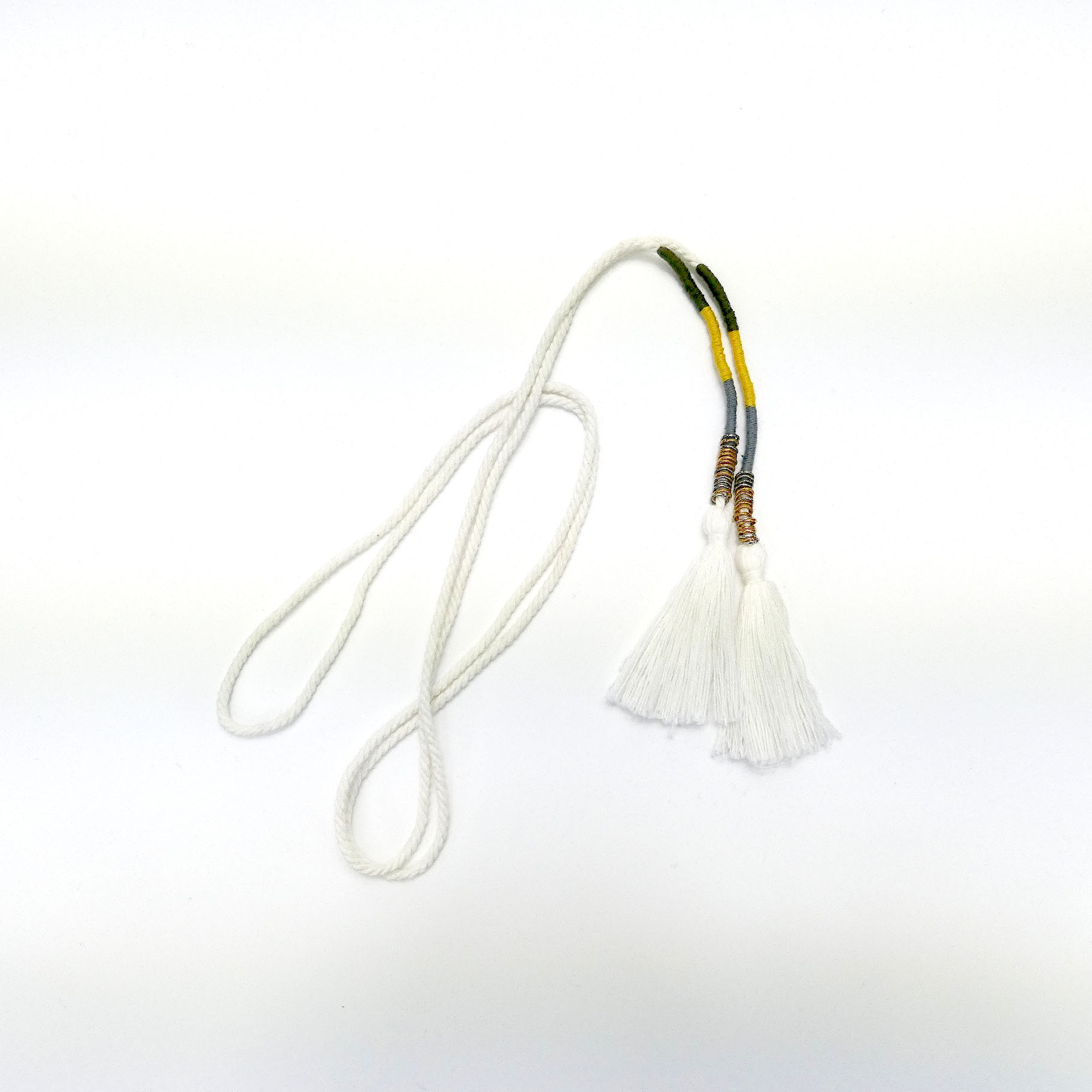 Ceinture coton pompons avec fil polyester et petit anneaux métal.