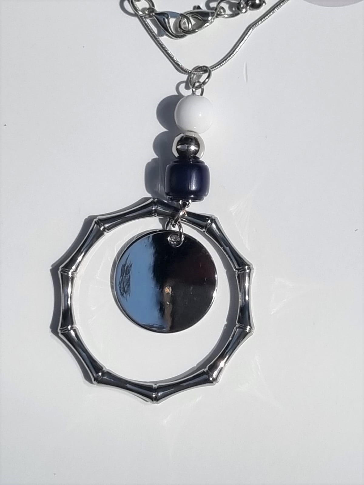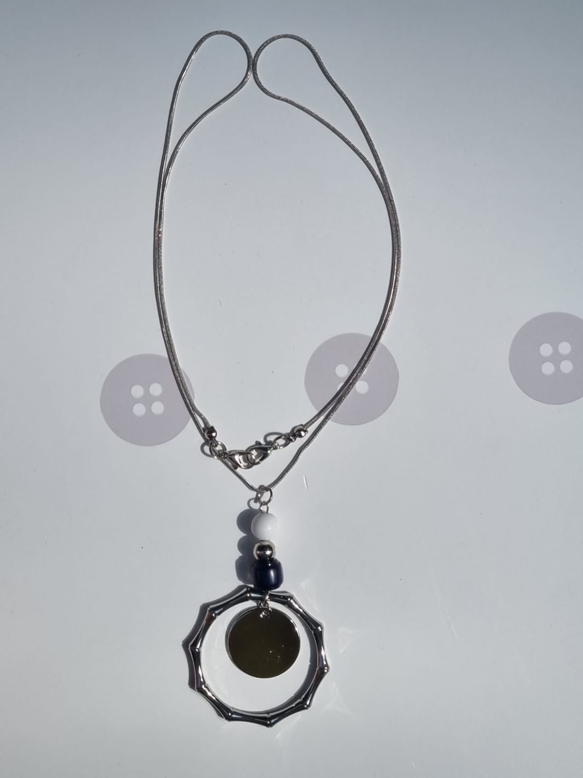 Collier coloris argent, attache mousquetons, avec anneau argent et perles nylons.