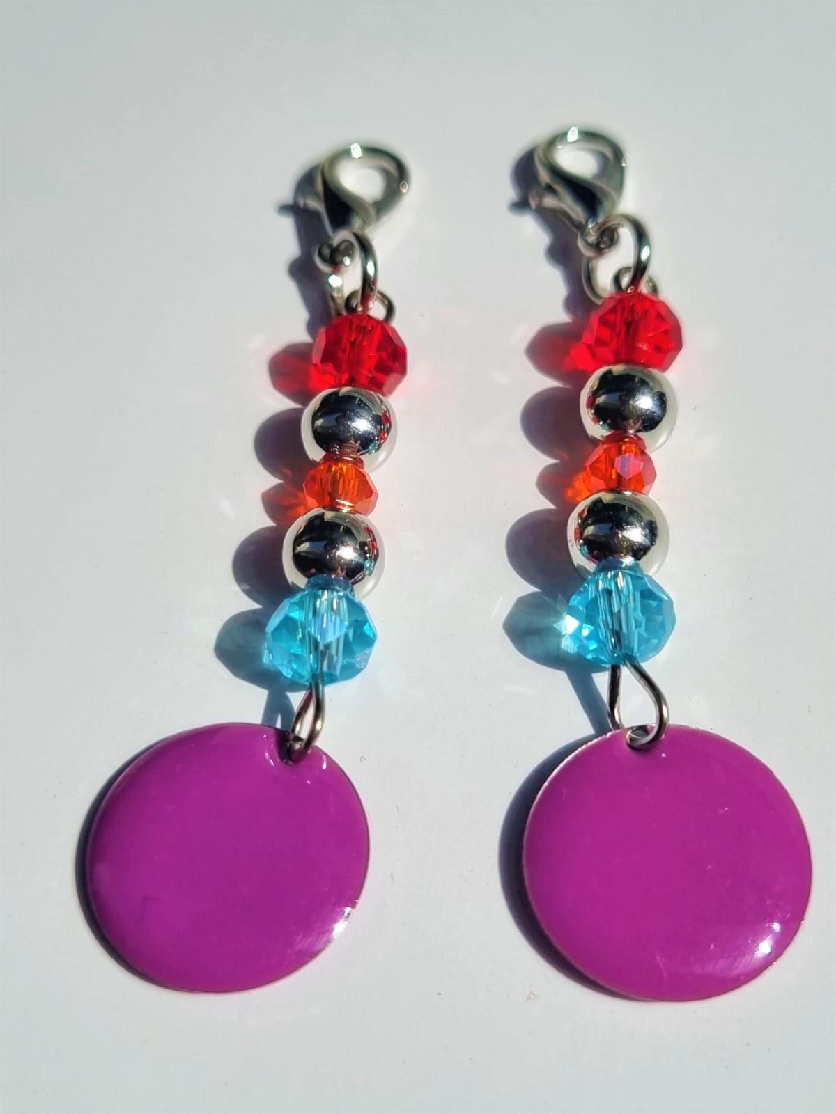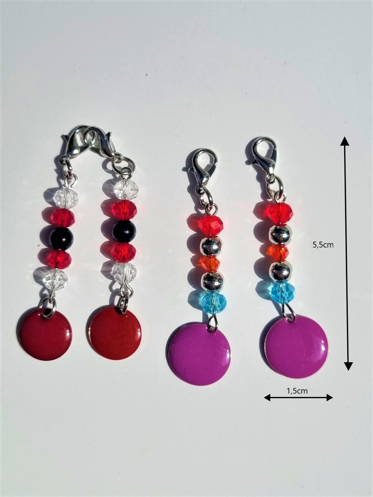 Petits pendantifs émaillés ,mousquetons, avec perles finition argenté.
